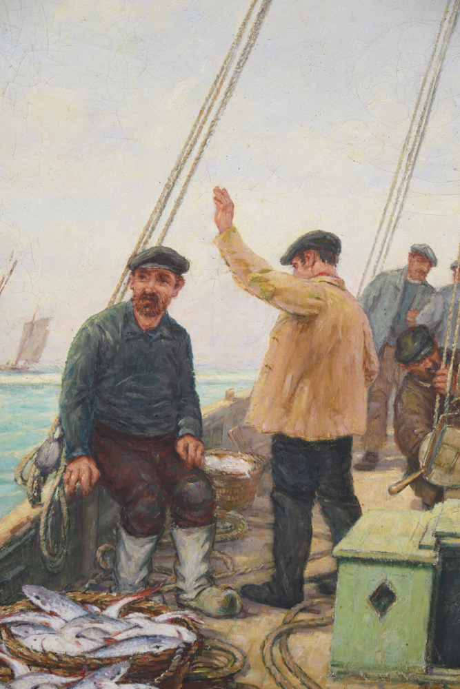 Richard-André Le Blanc est un artiste peintre né, formé et installé à Granville. Il a représenté la vie quotidienne de Granville sous de multiples aspects : le marché, le port, les scènes de pêche, etc. Il s’agit ici d’une scène de pêche représentée à bord d’une bisquine, bateau traditionnel de la Baie du Mont-Saint-Michel. Les paniers en osier sont pleins, correspondant au titre donné « Retour de pêche », corroboré également par la faible activité du bord.